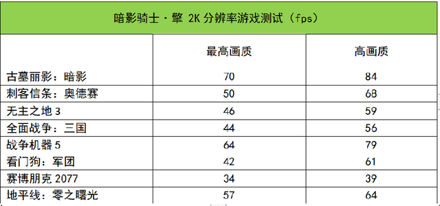 实测来看,暗影骑士·擎基本能在2K分辨率下以最高画质比较流畅地运行部分单机大作,但其在最新游戏的2K最高画质下的平均fps还是稍有一些勉强,对于这部分游戏玩家可以切换到高画质,流畅度能提升不少,基本能保证60fps左右的帧速。另外,对于支持DLSS的游戏,则可以在2K下开启DLSS,比如《赛博朋克2077》在2K分辨率高画质下开启DLSS平衡,平均帧速能到61fps——从卡顿变为流畅。