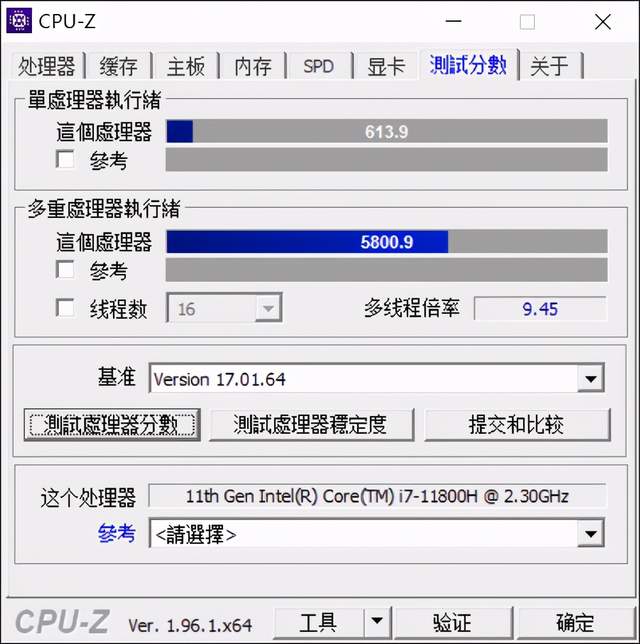 ▲CPU-Z基准测试,i7 11800H多线程为5800,单线程613。超过i7 10870H的成绩4702和501——即便该项测试时间非常短,但多线程领先幅度也达到了23%。此外,锐龙7 5800H的多线程成绩为5560。