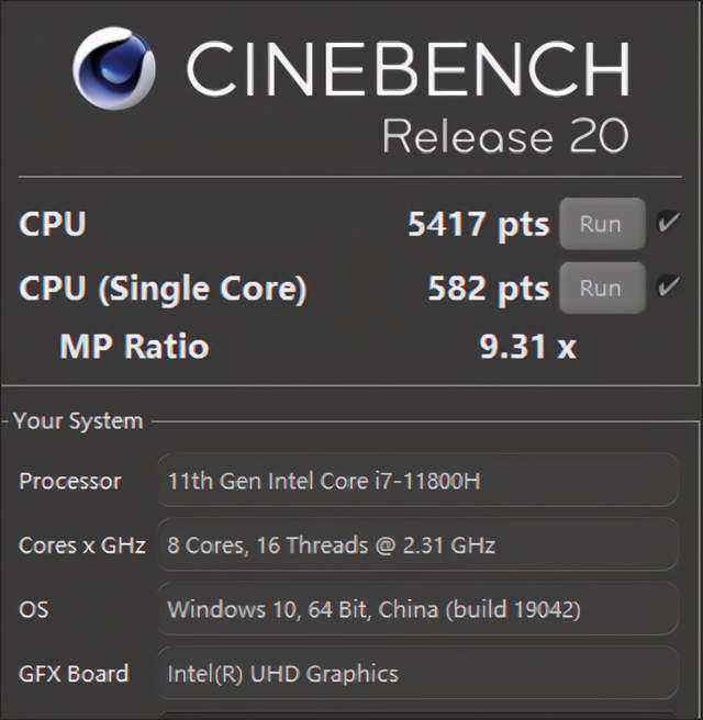 ▲Cinebench R20测试,i7 11800H多核得分为5417pts,单核为582pts。作为参考,i7 10870H多核为3645pts,单核为471pts。这项测试时间更长一些,其多核提升幅度达到了48%!单核为23%。另外,跑110W的i7 10875H多核分数是4106pts,i7 11800H同样远超110W的i7 10875H。而跑47W的锐龙7 5800H参考成绩是4699pts,也弱于i7 11800H。