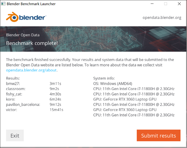 ▲继续加大压力的重度负载测试,Blender Benchmark六个场景连续渲染,软件版本选择为2.91.2,由于场景数量较多,所以该测试即便是对于8核处理器来说也需要四五十分钟,足以考察处理器满载时的运行情况。最终,暗影骑士·擎的i7 11800H耗时时间如上图所示。