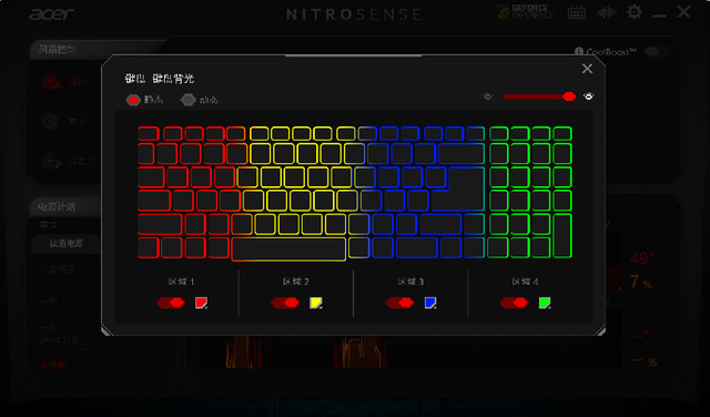 表面温度和噪声:键盘区域热量堆积在按键KL和光标按键等区域,最高在 47℃左右,W、S按键区域基本不到40℃,碗托区域凉爽。风扇噪声方面,此时风扇转速达到了最高,噪声明显,键盘上方为59dBA,用户位大概为49dBA。所以日常玩游戏时建议大家设定为自动模式,运行游戏时并不会双核心满载,自动模式够用了,风扇噪声低得多。