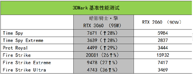 从3DMark的基准测试结果来看,暗影骑士·擎搭载的95W款RTX 3060 相对于上一代90W款的RTX 2060,综合提升幅度比较接近30%。其中Fire Strike Ultra项目领先幅度比较大,达到了36%。考虑到相近的功率,新平台30%左右的性能提升幅度还是不错的。