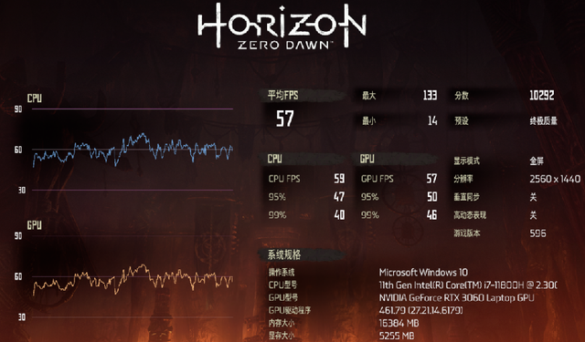 ▲《地平线:零之曙光》,2K下最高画质平均帧数57fps,高画质为64fps。