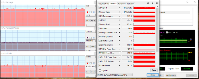 接下来我们再看看该机在双核心满载时的表现。室温25℃左右,利用Aida64和FurMark对暗影骑士·擎进行双考测试(风扇为最大模式),一个半小时之后的情况如下所示:i7 11800H处理器的封装功耗约为45W,频率在2.8GHz左右,温度则是82℃;GeForce RTX 3060的功耗为80W,频率1460MHz左右,温度则为71.5℃。