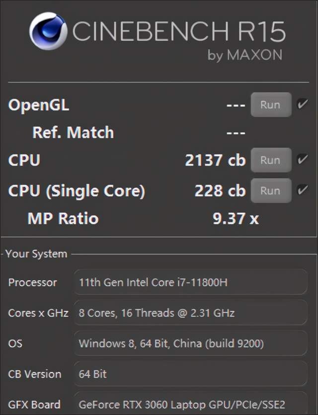 ▲常规Cinebench R15测试,i7 11800H的多核分数为2137cb,单核分数228cb。作为参考,稳定70W性能释放的i7 10870H(下同,简称i7 10870H)多核成绩为1637cb,单核成绩为196cb——该项测试中,i7 11800H的多核性能提升幅度达到了30%!几乎可以说是性能跃升了!单核性能提升幅度则达到了16%。另外牛叔再提供一个稳定输出47W锐龙7 5800H的成绩:多核1996cb,不敌i7 11800H。