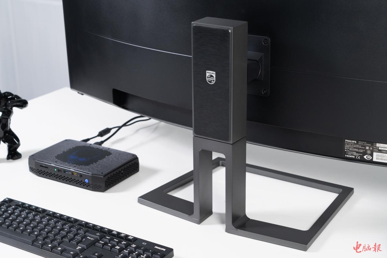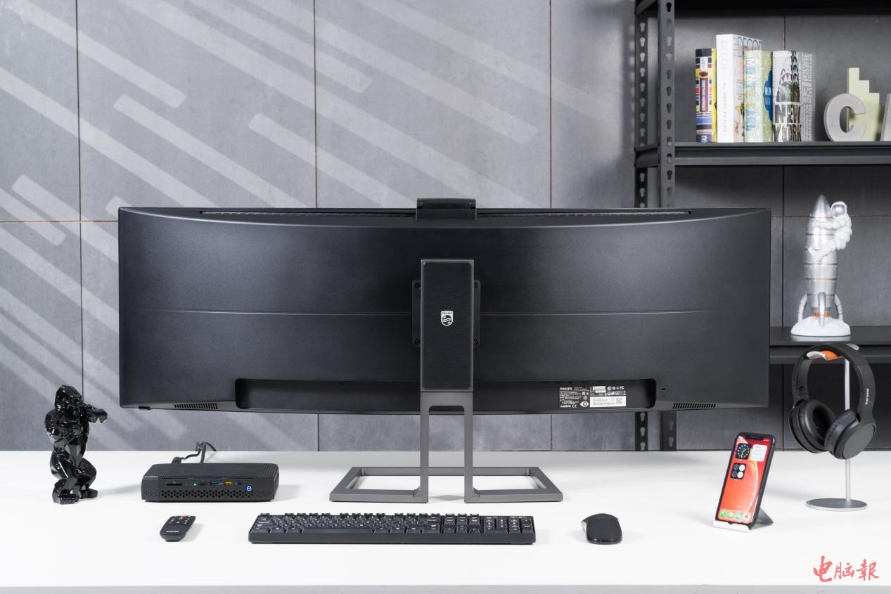 一看到飞利浦499P9H1肯定会被其32:9比例48.8英寸的大屏幕给震惊到,毕竟光是屏幕的长度都达到了1194mm,算得上是桌面巨无霸了,几乎将整个视野全部占据,视觉体验非常的震撼。为了显示器放置的稳定,飞利浦499P9H1配备了非常宽大的底座,镂空设计便于用户放置手机等小物件,减少了桌面空间的占用。如果是双显示器拼接的话,两个显示器底座会占用更多的空间,让本就紧张的办公桌面雪上加霜。此外飞利浦499P9H1还支持VESA壁挂,装在支架上更节省空间。