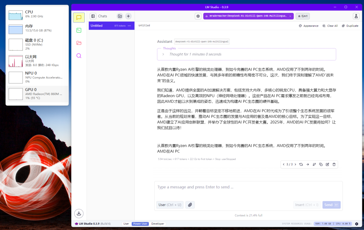 AI应用越来越普及,ThinkPad T14 Gen6锐龙版作为AI笔记本,具备50 TOPs的NPU算力,当然也提供了高效的AI加速能力。锐龙AI 7 PRO 350在本地AI应用中,可以选择使用CPU、NPU或者GPU进行加速。例如在LM Studio中,我们用锐龙AI 7 PRO 350内置的Radeon 860M GPU加载DeepSeek 14B蒸馏模型来生成文字内容,处理速度大约为7.14 Tokens/s,用CPU来计算,处理速度大约为5.94 Tokens/s。对于一些端侧轻载AIGC应用(例如生成文字内容、处理文档、生成新媒体配图等等)来讲,这个速度完全可以满足需求。特别值得一提的是,ThinkPad T14 Gen6锐龙版依托AMD独特的UMA(统一内存架构)技术,支持最高划分16GB内存作为集显的专用显存,因此在支持AI模型的能力上与拥有16GB显存的独显相当,所以也称得上是性价比很高的本地AI解决方案。当然,如果使用锐龙AI 7 PRO 350的CPU进行AI加速,那么配备32GB内存的ThinkPad T14 Gen6锐龙版还可以加载更大的AI模型,可以说在这方面它对AI模型的适应能力也是不错的。