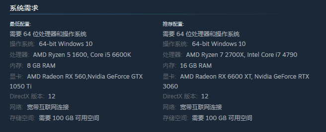 在当下显卡价格居高不下的时代,看到《战地风云2042》这样的新作,玩家们最为关心地肯定是自己的配置能不能带得动的问题。就官方给出的的系统需求来说,这款游戏对于硬件的要求并不是太高。锐龙5 1600/酷睿i5 6600K处理器+8GB内存+RX 560/GTX 1050Ti即可满足游戏运行的最低需求。而推荐配置为锐龙7 2700X/酷睿i7 4790+16GB+RX 6600XT/RTX 3060,意味着当下主流的中端显卡就够用了。