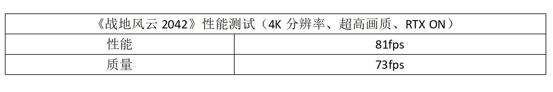所以DLSS就成了当下玩转实时光线追踪游戏的最佳搭档。于是我们在《战地风云2042》中也对开启DLSS和实时光线追踪之后的游戏性能表现进行了测试。在开启了DLSS之后,就算是在质量挡下,画面的平均帧速也提升到了73fps,如果是切换到性能挡,更是能达到81fps。考虑到这是在4K分辨率、超高画质、开启实时光线追踪以及交火比较激烈的场景中,DLSS对游戏性能的提升是相当明显的。
