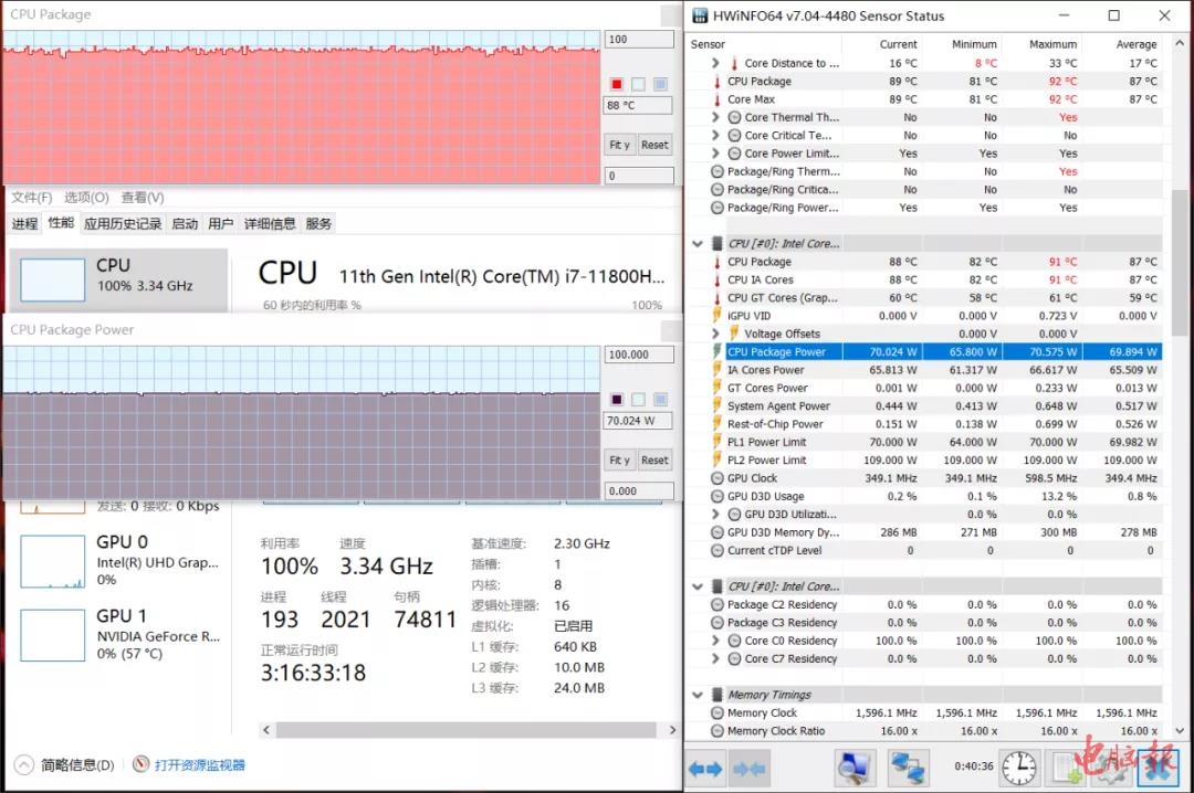 处理器方面,暗影骑士·擎所搭载的英特尔第11代酷睿i7 11800H处理器,在处理器单负载下的稳定性能释放最高是70W。如下图所示,在Aida64中单考处理器(单考FPU),风扇模式设定为最大(以测试该机的最高性能释放),考机进行到40分钟时,处理器稳定跑在70W的状态下。而且整个考机过程中的平均功率也是70W左右——足以说明该机的持续性能释放情况了。