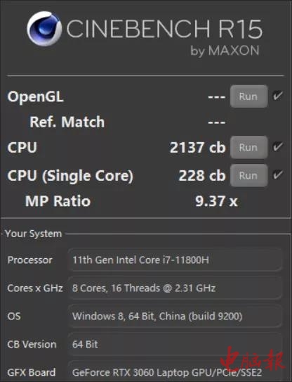 ▲Cinebench R15测试,i7 11800H的多核分数为2137cb,单核分数228cb。稳定70W性能释放的i7 10870H(下同,简称i7 10870H)多核成绩为1637cb,单核成绩为196cb——该项测试中,i7 11800H的多核性能提升幅度达到了30%!几乎可以说是性能跃升了!单核性能提升幅度则达到了16%。另外牛叔再提供一个稳定输出77W锐龙7 5800H的成绩:多核2101cb,略逊一点儿。