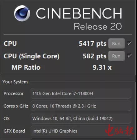 ▲Cinebench R20测试,i7 11800H多核得分为5417pts,单核为582pts。作为参考,70W款的i7 10870H多核为3645pts,单核为471pts。这项测试时间更长一些,其多核提升幅度达到了48%!单核为23%。77W的锐龙7 5800H参考成绩是4940pts,基准测试中稍弱于i7 11800H。