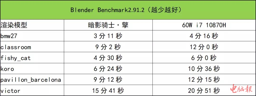 满载应用测试牛叔选择的是Blender Benchmark六个场景连续渲染,软件版本选择为2.91.2,最终暗影骑士·擎的i7 11800H耗时时间如下图所示。可以看到,在Blender Benchmark2.91.2连续渲染测试中,70W的i7 11800H大幅度领先60W版本的i7 10870H(70W的i7 10870H机型测试较早,未参与该项测试),在渲染时间越长的测试中领先幅度越明显,这说明i7 11800H性能升级的确非常强悍!