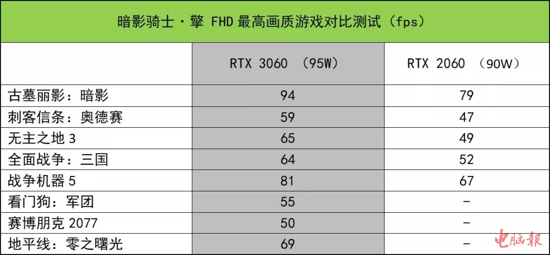 游戏性能方面,暗影骑士·擎搭载的是95W款RTX 3060,相比上一代RTX 2060机型基准性能提升幅度在30%左右。FHD游戏对比实测中,暗影骑士·擎搭载95W款的RTX 3060相对90W款RTX 2060有较大幅度的领先。值得注意的地方是,上一代甜品独显RTX 2060在FHD下面跑50fps左右的游戏,RTX 3060可以跑到60fps左右,是个不错的提升。另外可以看到,95W款RTX 3060在FHD最高画质下跑《赛博朋克2077》平均帧速约50fps,可玩。
