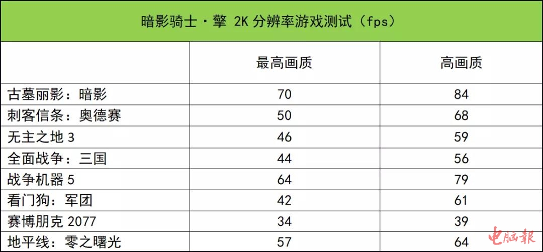 2K分辨率下,暗影骑士·擎能在最高画质下比较流畅地运行部分单机大作,但其在最新游戏的2K最高画质下的平均fps还是稍有一些勉强,对于这部分游戏玩家可以切换到高画质,流畅度能提升不少,基本能保证60fps左右的帧速。另外,对于支持DLSS的游戏,则可以在2K下开启DLSS,比如《赛博朋克2077》在2K分辨率高画质下开启DLSS平衡,平均帧速能到61fps——从卡顿变为流畅。
