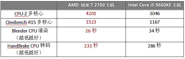 ●锐龙7 2700机型由于具备8核心16线程,在3D渲染、视频编码等专业设计应用和多任务应用中表现远超Core i5 9600KF机型。
