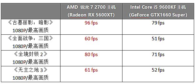 在部分玩家心目中,可能依然觉得玩游戏还是选Intel处理器好,事实上第三代锐龙由于IPC和频率都大幅提升,已经可以在很多游戏中战平甚至反超Intel的高频旗舰了。而第二代锐龙虽说频率方面比不上第三代锐龙,但由于性价比超高,玩家可以利用价差来升级显卡,例如锐龙7 2700这一套机型就选配了Radeon RX 5600XT,性能定位是明显高过Core i5 9600KF机型的GTX1660 SUPER的。从测试结果可以看到,锐龙7 2700机型在游戏方面的优势实在是太明显了,帧速远超Core i5 9600KF机型,差不多提升了一个等级。那么,花同样多的钱买的电脑到底谁玩游戏更爽,这个结果已经很明显了。