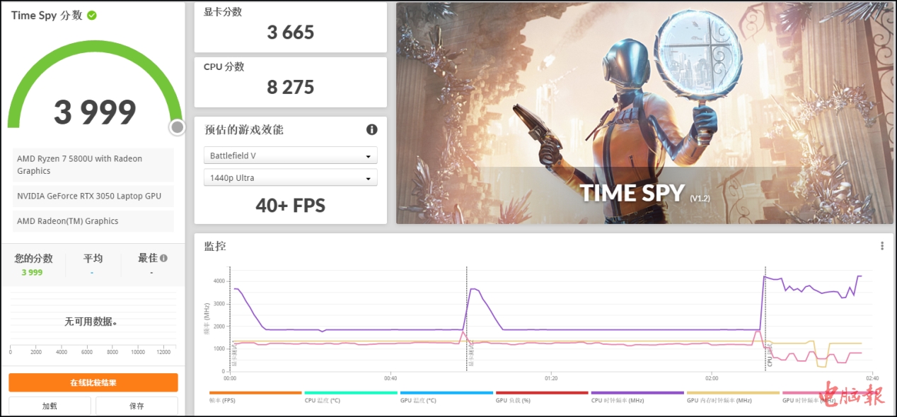 RTX 3050的流处理器数量为2048个,显存4GB,是目前RTX 30系的入门游戏独显。从显卡得分来看,在DX 12的Time Spy场景测试中,传奇X RTX 3050的显卡得分3665;在DX 11的 Fire Strike场景中,传奇X RTX 3050的显卡得分是9762。而在牛叔的轻薄本评测数据库中,MX 450的参考得分分别是1596和4876。也就是说,虽然都是轻薄本,但传奇X搭载的RTX 3050基准性能是常规轻薄本搭载的MX450的两倍左右,完全不是一个量级的表现,也让该机在娱乐/应用方面有了更多的可能性。
