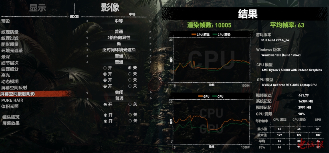 ▲发布时间较早的一款古墓丽影系列游戏,因此对硬件没有太高要求。传奇X RTX 3050跑高画质的平均帧速是67fps,中画质是72fps,流畅度很好。