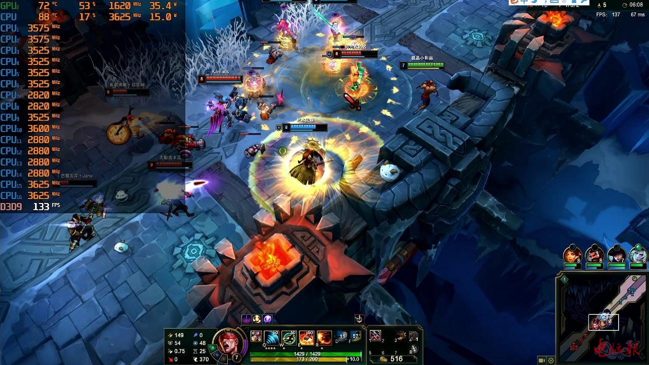 ▲经久不衰的全球最热门电竞游戏《LOL》,这款游戏对显卡要求也不高,但对处理器的频率要求高,传奇X RTX 3050的锐龙7 5800U跑个15W足够了,极地大乱斗地图团战时也有100左右FPS。