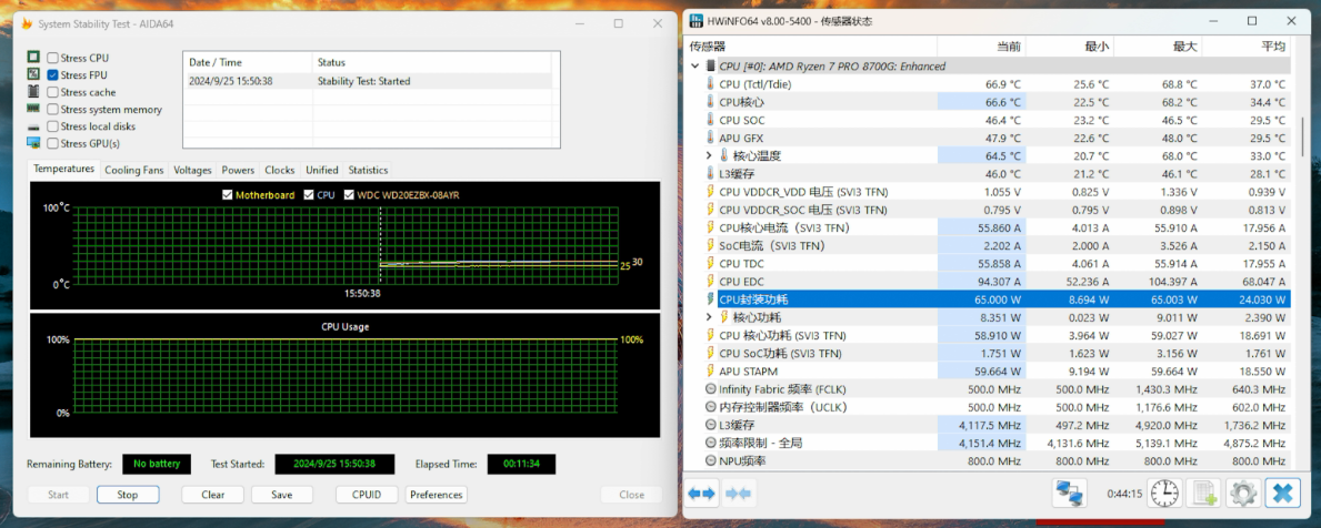 ▲锐龙7 8700G满载考机温度仅为66.9℃