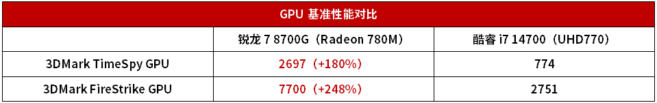 锐龙7 8700G搭载的Radeon 780M核显在硬件规格上展现出强劲实力,它集成了12个CU单元与768个流处理器,核心频率可飙升至2900MHz,在基准测试中巨幅领先UHD770。酷睿i7 14700内置的UHD770核显明显落后,这就导致它在面对涉及GPU性能的生产力工具时会出现性能瓶颈。更令人担忧的是,UHD770的算力水平是很难支撑本地AI内容创作需求的,这种代际差距就让酷睿i7 14700在核显层面全面落后于锐龙7 8700G了。