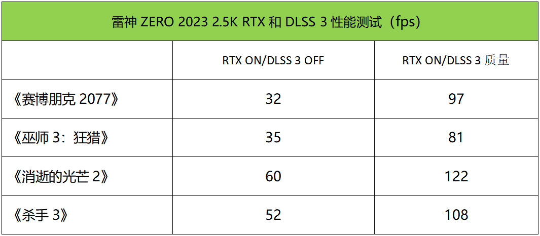 接下来看看光追性能和DLSS 3测试的情况,DLSS 3可以说是RTX 40系独显的核心功能,开启之后能让游戏帧率得到极大的提升,那么实战效果如何?下面的游戏实测中,我们采用两组对比测试,分别是2K最高画质+RTX最高关闭DLSS 3和2K最高画质+RTX最高开启DLSS 3质量。