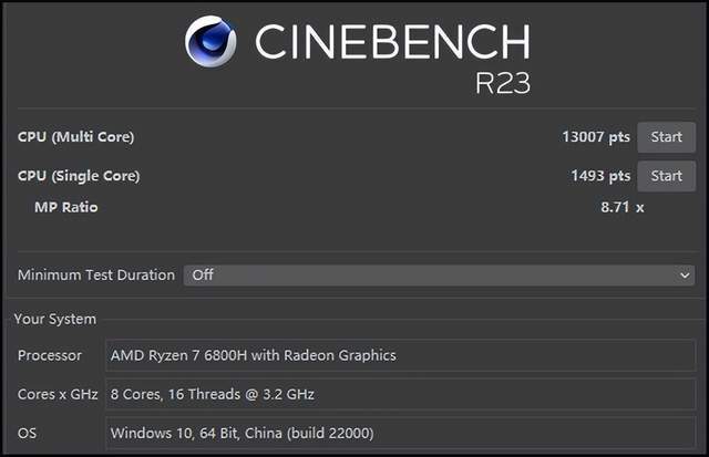 ▲Cinebench R23测试,无畏Pro15 2022锐龙版多核得分是13007pts,单核1493pts,表现不错。