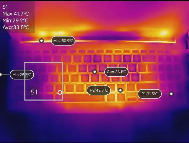 表面温度和噪声:键盘区域热量堆积在右Ctrl按键附近,键帽在42℃左右,有轻度热感,W、S按键区域基本不到40℃。此时风扇达到了高转速,用户位噪声比较明显,但不吵闹。