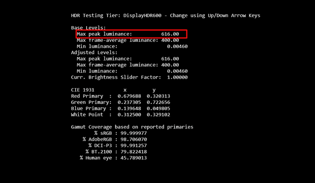 亮度方面,SDR日常使用模式下,最高亮度可以达到408nits。而开启HDR之后,峰值亮度可以达到616nits,也就是达到了HDR600标准,更高的亮度意味着更多的应用场景,在室外也可以获得更清晰的画面。