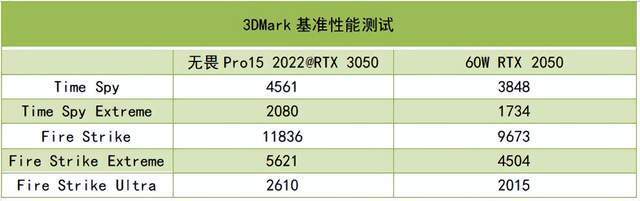 无畏Pro15 2022锐龙版搭载的RTX 3050在3DMark Time Spy场景中的显卡得分是4561,相比60W RTX 2050快约18%。在Fire Strike测试场景得分为11836,60W RTX 2050是9673,比后者快约22%。显然,在轻便全能本上,RTX 3050性能要强一个级别,也更有吸引力!