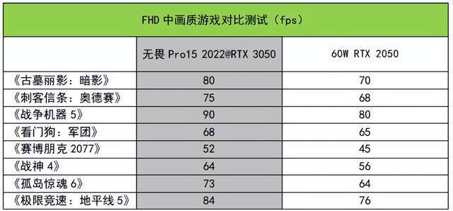 在FHD游戏对比实测中,无畏Pro15 2022锐龙版应对3A大作中画质基本没什么问题,除了烂优化的《赛博朋克2077》以外,所有的测试游戏平均帧速都能跑到60fps以上,部分游戏开启高画质也可流畅运行,比如《古墓丽影:暗影》《刺客信条:奥德赛》《战争机器5》等等。另外相比60W的RTX 2050帧数有不错的提升,配合120Hz高刷屏,玩游戏的流畅度更高。