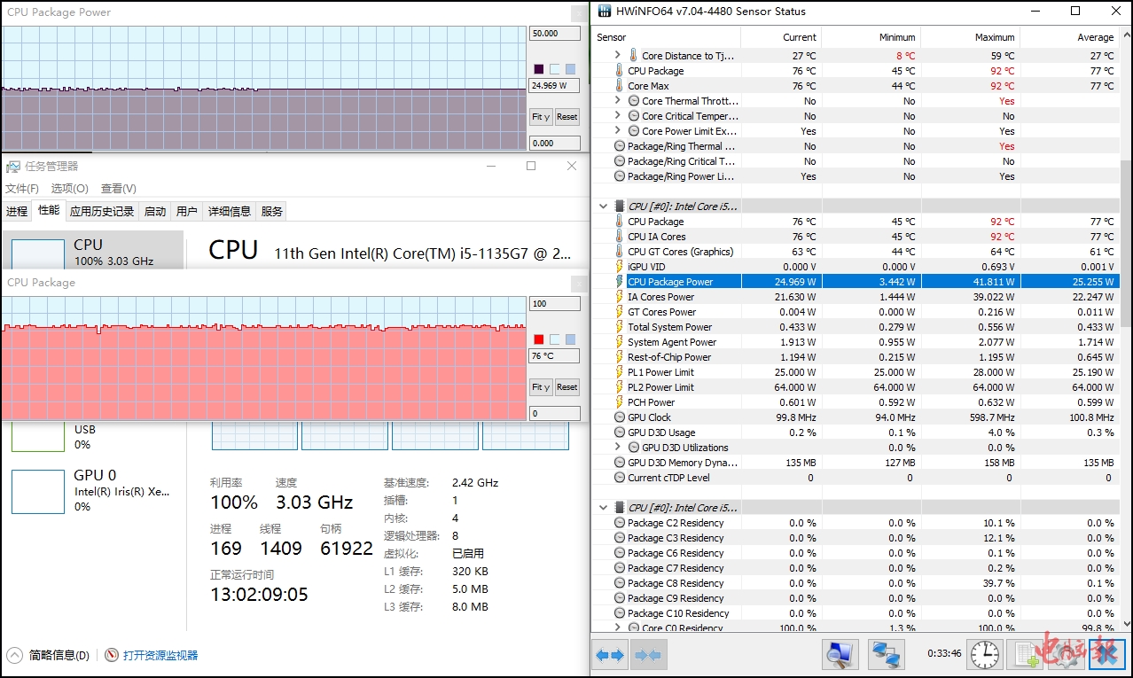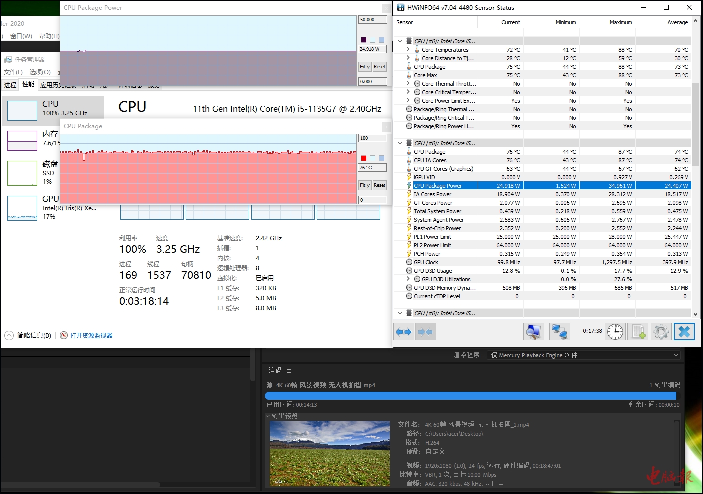 具体到非凡S3身上,室温25℃左右,在最高性能模式下(可用Fn+F切换,支持三种模式)利用Aida64对非凡S3进行单考FPU测试,以考察该机的持续稳定性能释放情况。半小时后情况如下所示:处理器稳定运行在25W的功率下,频率约为3GHz,i5 1135G7的温度则在76℃左右。即,非凡S3的稳定性能释放是25W(爆发40W+),同时满载时的内核温度也不算高。