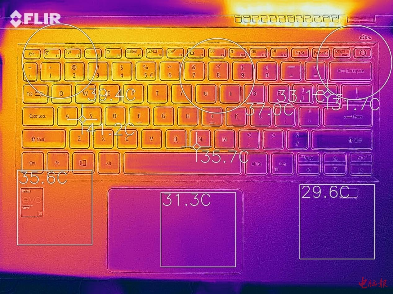 表面温度和噪声:C面热量堆积在键盘靠左区域,最高的地方是按键S、D附近,温度约41℃,其他位置则在40℃以内。由于该机是金属C面,所以尽管考机时温度并不高,但给人的感受是热感较明显,当然还远说不上烫。噪声方面,键盘上分的噪声约46dBA,用户位的噪声约39dBA,在安静的房间里可听到较低的风扇噪声,在办公环境下则无感。