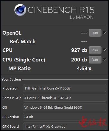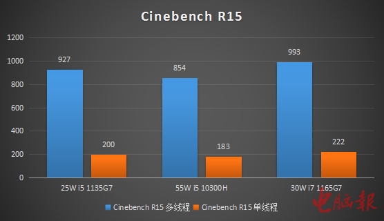 ▲Cinebench R15,非凡S3搭载的i5 1135G7的多核得分是927cb,单核200cb。55W款i5 10300H的多核是854cb,单核183cb,30W款的i7 1165G7的多核是993cb,单核222cb。i5 1135G7正好处于两者之间,而不管是单核还是多核,基准测试都超过了上一代同规格标压处理器。