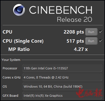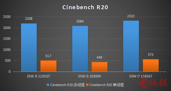 ▲Cinebench R20测试,非凡S3搭载的i5 1135G7的多核得分是2208pts,单核为517pts。55W款i5 10300H的多核是2084pts,单核449pts,30W款的i7 1165G7的多核是2322pts,单核573pts。同样的,i5 1135G7强于i5 10300H,稍弱于i7 1165G7——主要是单核性能有所不及,毕竟后者的最高加速频率是4.7GHz。