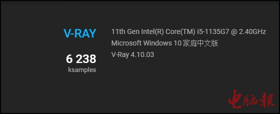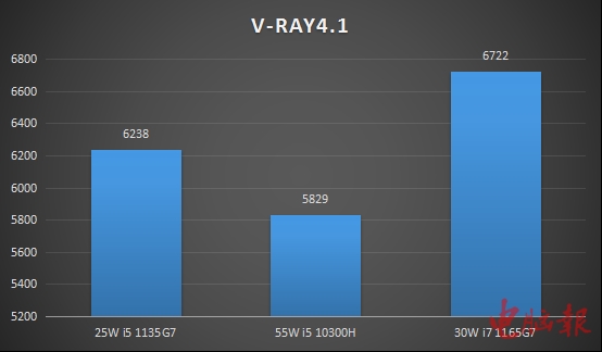 ▲V-RAY基准测试,分数越高代表性能释放越强。非凡S3的处理器分数为6238,而55W的i5 10300H是5829,30W的8核i7 1165G7处理器的得分为6722。