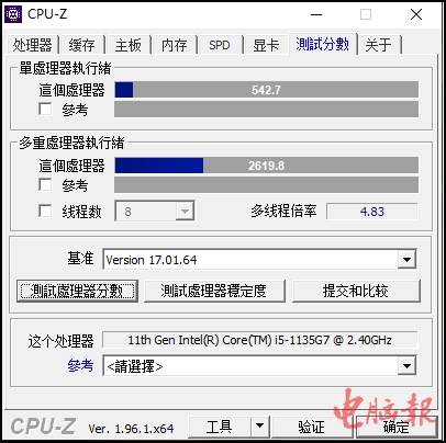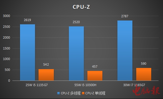 ▲CPU-Z基准测试,i5 1135G7多线程为2619,单线程542。同样超过55W的i5 10300H,后者的多线程是2520,单线程是457。