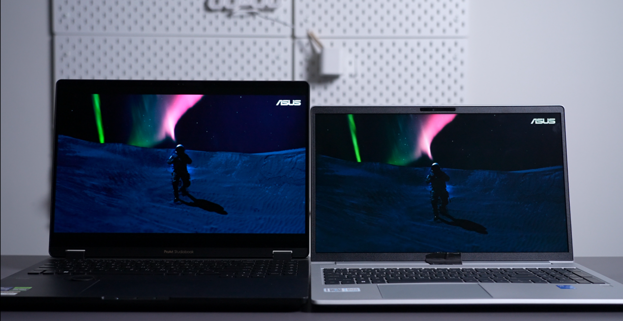 ▲看看实际显示效果如何,播放HDR视频对比,左侧是ProArt 创16 2023,右侧是普通IPS屏,明显左侧的ProArt 创16 2023画面更加通透,层次感更好,明暗之间看起来赏心悦目,而且细节保留得很好。普通IPS屏就比较寡淡了,细节丢失严重。
