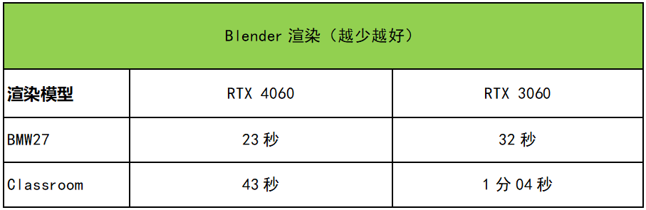 Blender是一款开源的跨平台全能三维动画制作软件,支持处理器和独显渲染,这里我们通过对比RTX 4060的CUDA加速测试,来考查ProArt 创16 2023的独显渲染性能,并且加入了RTX 3060的测试成绩作为对比。从测试成绩来看,RTX 4060 GPU CUDA渲染效率非常不错,相比RTX 3060提升明显,其渲染Classroom场景仅需43秒就能完成。