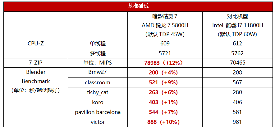 其实有关AMD锐龙7 5800H处理器的测评数据大家已经看过很多了,这里我们主要是看看惠普暗影精灵7上这颗默认TDP 45W的AMD锐龙7 5800H的性能释放水平到底如何。从测试来看,虽然60W的Intel酷睿i7 11800H在CPU-Z这样的短期爆发测试中表现略有优势,但在需要长时间满载渲染输出的Blender测试中就明显不及7nm工艺的AMD锐龙7 5800H了,而我们实测发现,这颗AMD锐龙7 5800H在惠普暗影精灵7上功耗释放达到了60W,性能确实超出预期,3D渲染输出性能最多超过Intel酷睿i7 11800H大约10%之多。