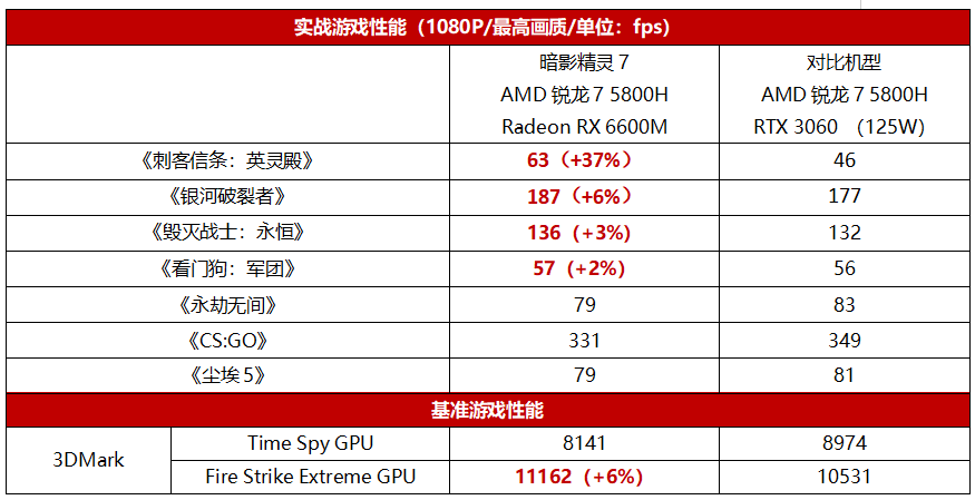 既然是AMD“双绝”游戏本,那么RX 6600M独显的性能当然是关注的焦点,而它和RTX 3060孰强孰弱呢?我们选择了一款同样采用AMD锐龙7 5800H处理器的游戏本来对比,它搭载了125W的RTX 3060显卡,基本上也是顶级规格了。从1080P游戏大作测试来看,RX 6600M和RTX 3060基本上是互有胜负,总的来说RX 6600M胜得略多,而在《刺客信条:英灵殿》这样的AMD优势游戏中,RX 6600M几乎保持了碾压的态势,优势达到了37%之多。而从基准测试部分来看,RX 6600M的DX11性能好于RTX 3060,RTX 3060的DX12性能又略好一点,这也符合RDNA2与安培架构各自的特色。