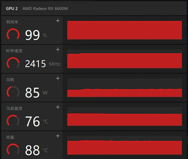 实战游戏中,暗影精灵7搭载的RX 6600M性能释放达到了85W,频率高达2415MHz