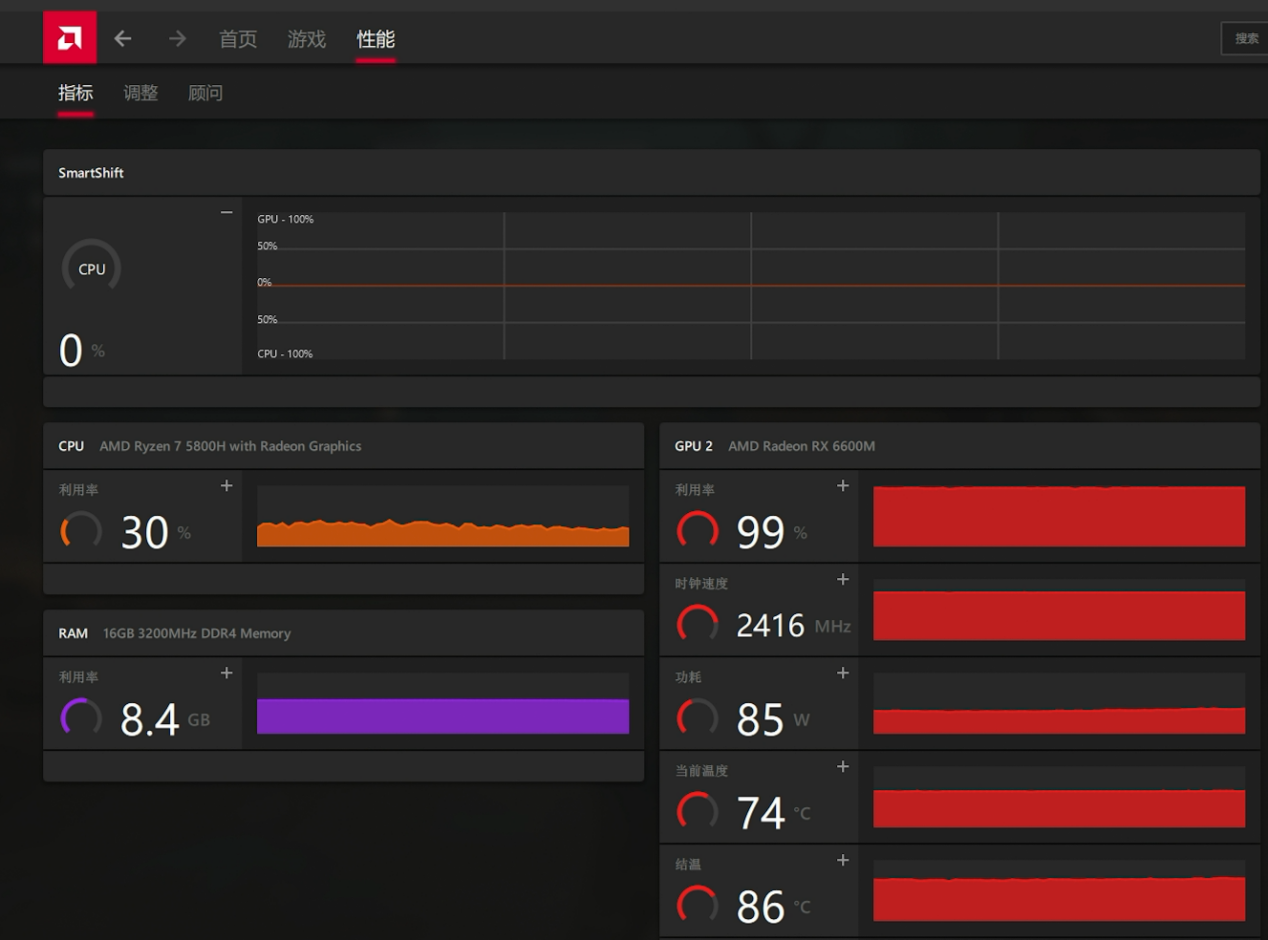 在AMD Radeon Software的性能指标面板中,我们可以看到SmartShift的工作情况