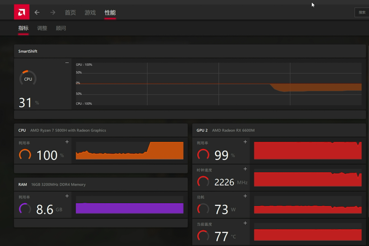 前面我们也介绍过了,锐龙5000移动处理器+RX 6000M显卡可以支持SmartShift自动平衡性能输出,针对不同应用智能调节CPU与GPU的功率比例,从而提供更好的性能和能效表现。那么它是怎么工作的呢?我们在AMD Radeon Software的性能指标界面下就可以看到SmartShift的工作情况,它对应的曲线代表了当前功率分配的侧重方向,向上则偏重GPU,向下则偏重CPU,从上图来看,我们运行《刺客信条:英灵殿》的时候显卡跑到了85W,此时CPU利用率仅30%,因此它们的总功率和散热条件其实还有富余,SmartShift用不着启动。