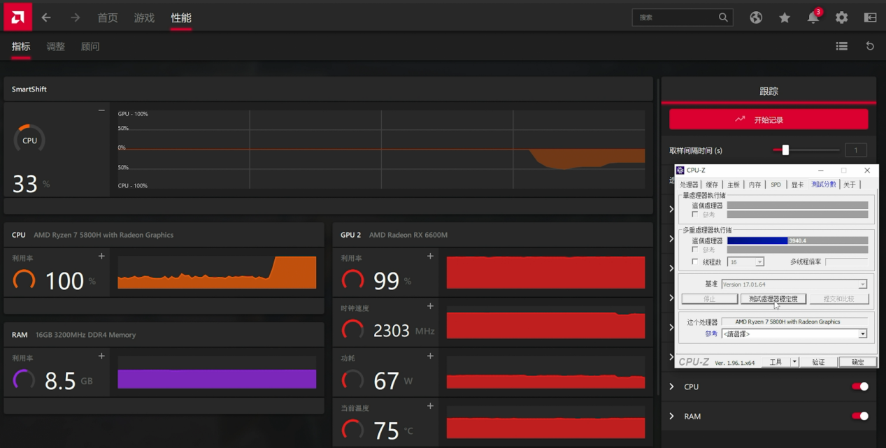 玩游戏时同时进行CPU-Z考机,SmartShift将总功率调整偏向CPU,调整幅度为33%