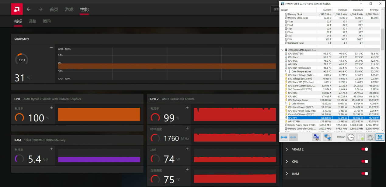 我们同时使用Prime95与Furmark对暗影精灵7进行双考(风扇转速此时达到最高,有比较明显的风声,在可接受范围内),此时由于是满功率输出,触发了SmartShift自动调整,可以看到CPU+GPU总输出大约135W左右,总功率偏向CPU大约31%,显卡输出75W左右,CPU的PPT功率大约60W的样子。温度方面,显卡最高75℃,处理器最高95℃,都属于正常表现。