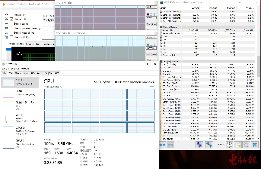 室温23℃左右,利用Aida64和FurMark对暗影骑士·龙进行双考测试(风扇为自动模式),半小时之后的情况如下所示:锐龙7 5800H处理器的功耗约为32W,频率在3.15GHz左右,温度则是90.3℃;GeForce RTX 3060的功耗为85W,频率1600MHz左右,温度则为76℃。