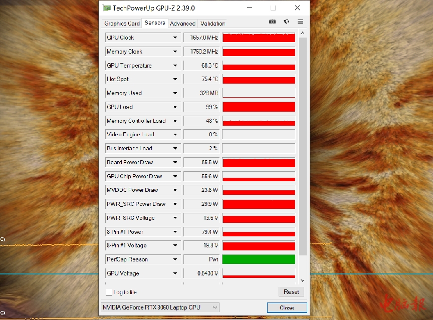 显卡方面,暗影骑士·龙搭载的RTX 3060则是85W常规款:在FurMark中单考独显时,RTX 3060的最高功率为85W——另外前几天牛叔刚做了95W款RTX 3060的测试,后面也有FHD/2K不同分辨率下的游戏对比。