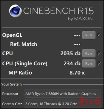 ▲Cinebench R15,暗影骑士·龙搭载的锐龙7 5800H的多核得分是2035cb。作为参考,上一代爆发54W持续性能跑45W的锐龙7 4800H的多核成绩是1875cb(下同),该项测试中多核性能提升幅度约为8%。重点是单核分数,锐龙7 5800H达到了234cb,而锐龙7 4800H则为187cb,单核性能提升幅度达到了25%,提升明显!
